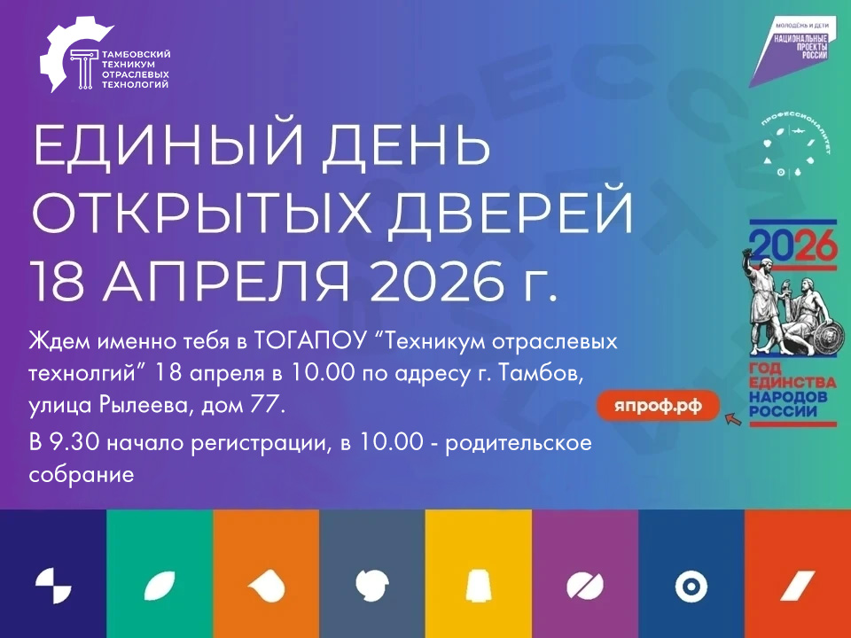 Приглашаем вас на Единый день открытых дверей в Техникум отраслевых технологий 18 апреля, в 9.30 начало регистрации. Это ваш шанс познакомиться с нами поближе и сделать первый шаг к востребованной профессии.